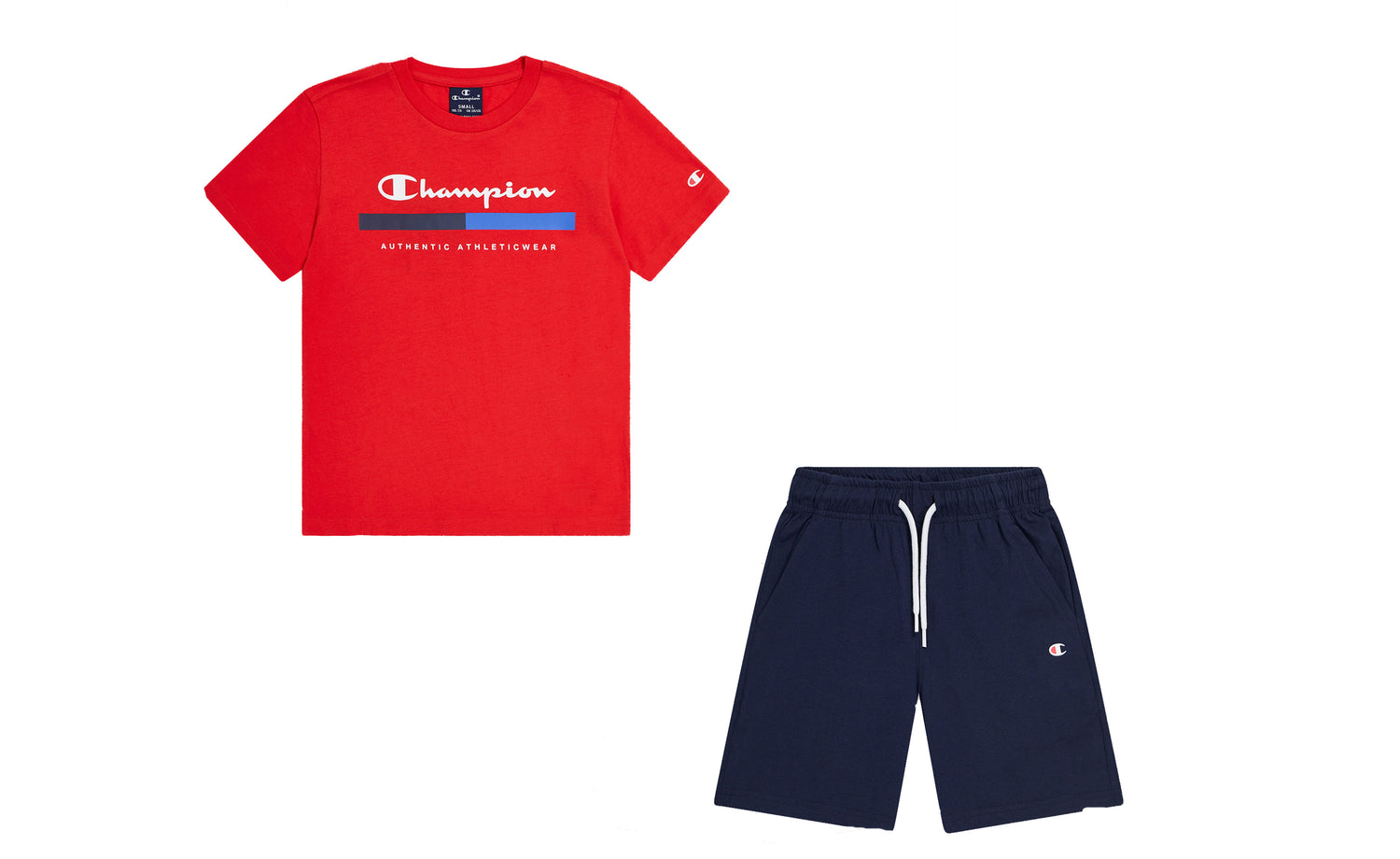 - Camiseta en color rojo. Pantalón marino con logo Champion.