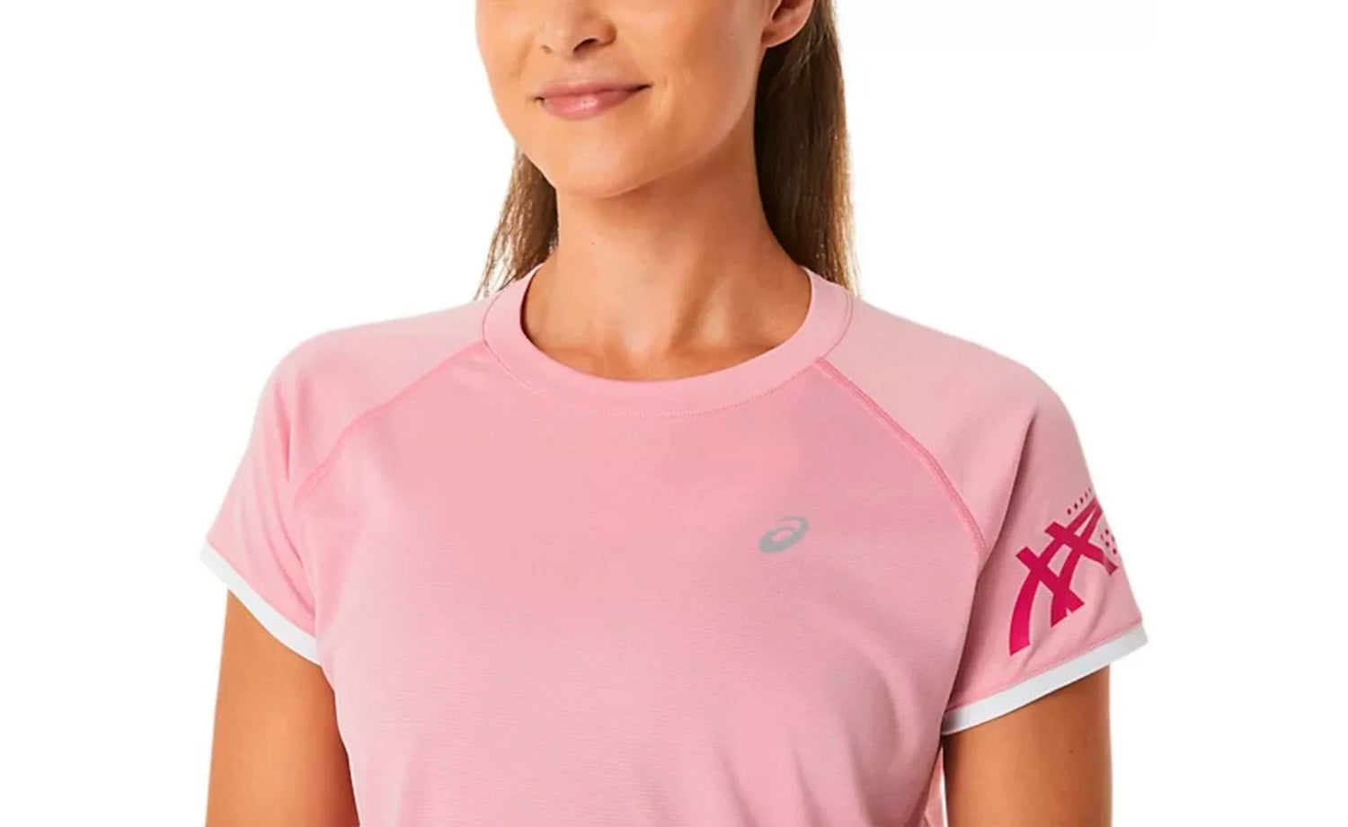 - Color rosa con logo ASICS reflectante estampado en el pecho.